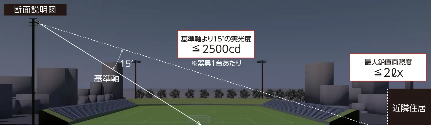 - ※4 最大鉛直面照度は近隣住居への侵入光などを抑制するための基準として用いることができる指標です。施設ごとに照明設計を行うことで確認可能です。