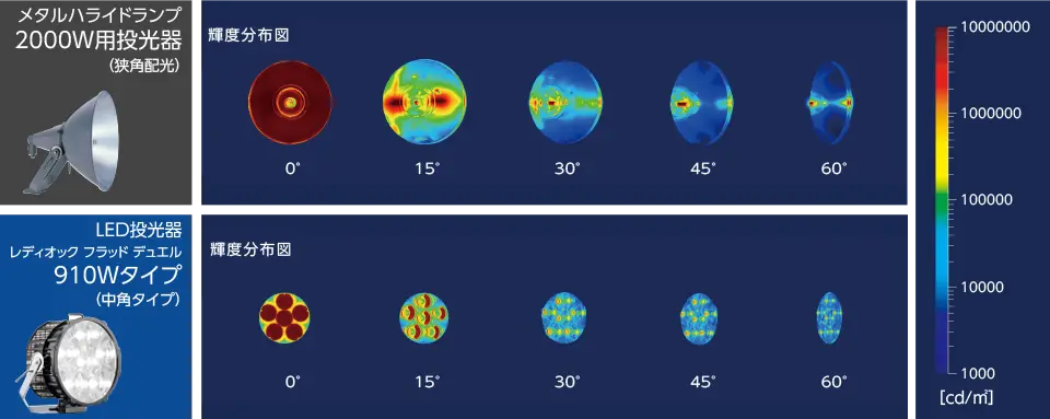 メタルハライドランプ2000W用投光器(狭角配光)とレディオック フラッド デュエル 910Wタイプ(中角タイプ)の最大輝度を比較すると正面は同じ水準です。さらに、角度が付くにつれメタルハライドランプ用投光器より、レディオック フラッド デュエルの方が最大輝度の値は低く抑えられています。