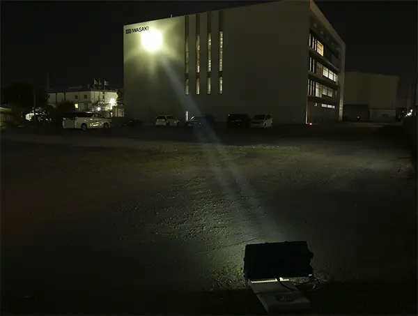 長距離の照射に適した投光器ですので、広い会場内のステージに注目を集めるスポットライトを当てたり、イベントの演出照明や、景観照明に効果的です。ビル上部のシンボルマークや、塔・煙突、屋根の上などへの照明のほか、屋上から地上のモニュメントを照明するなど、離れた位置からのスポット照明にも使用できます。