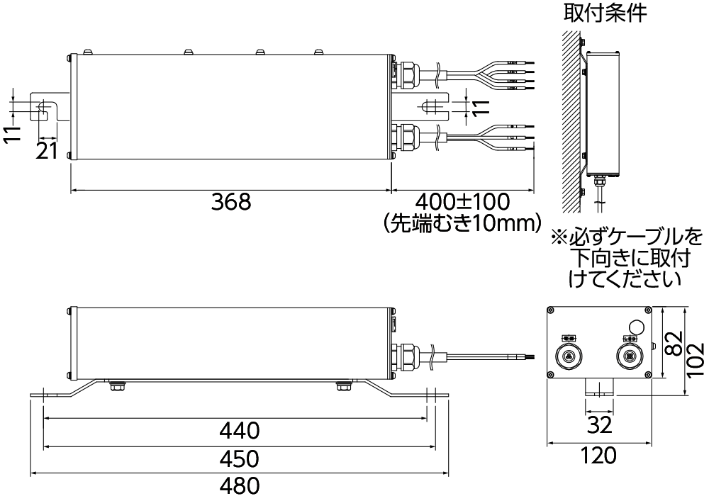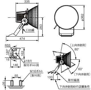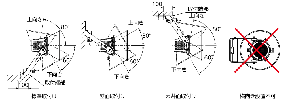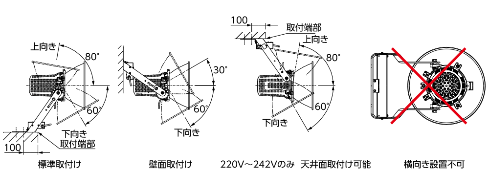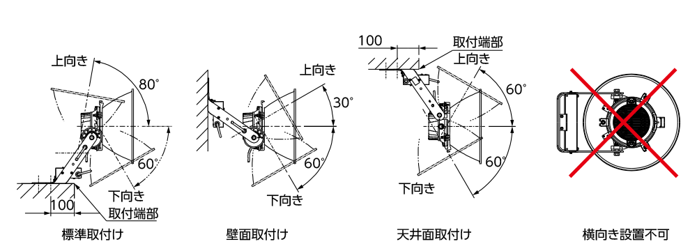 ※吊下げ設置する場合は、口出線が上を向かないように設置してください。