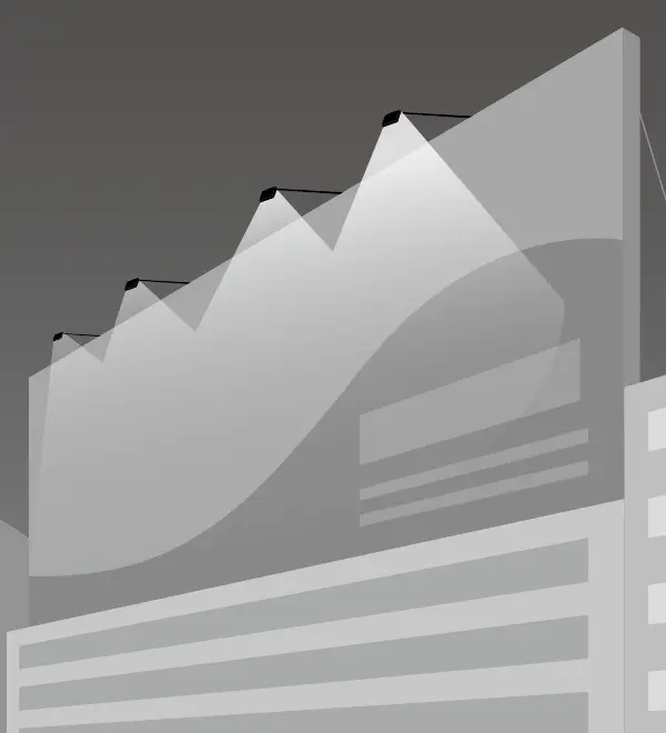 広告デザインを効果的に照らすため、独自設計により配光のむらを最小限に抑えました。縦長配光では器具側部分の光の広がりを改善し、最大高さ6mの大型看板の最下部まで照射することができます。横長配光では光のむらを改善し、幅広の看板を均一に照射します。