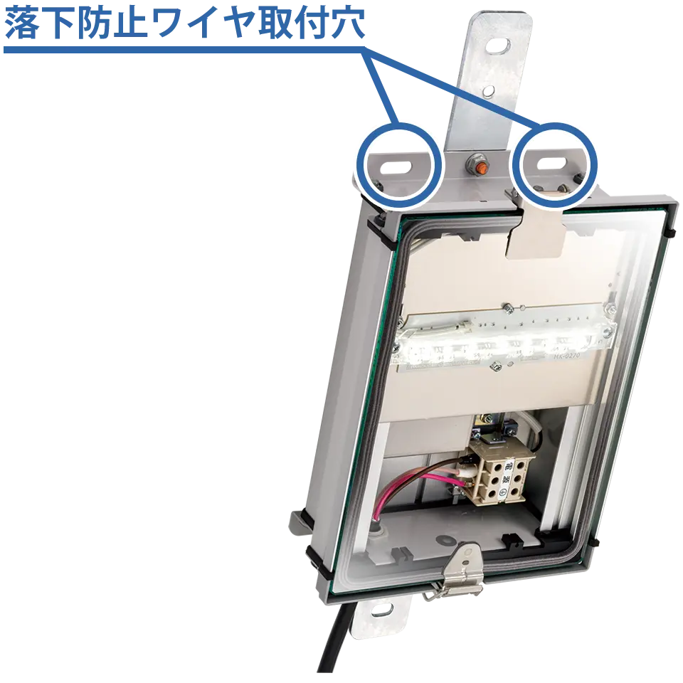 器具本体に落下防止のワイヤが取付け可能な穴加工を施しています。