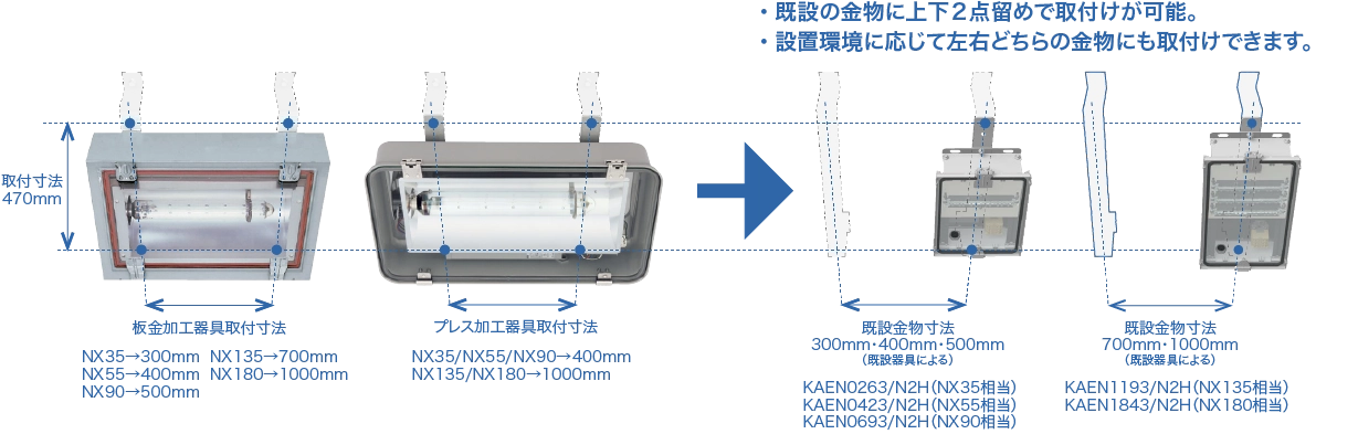 小形・軽量化により上下2点留めでの取付が可能となり、上下の取付寸法を既設器具と同寸法にしているので追加のアジャストプレートが不要で既設の金物へ取付けができます。(上下の取付寸法が470mmの板金加工器具、プレス加工器具に対応)