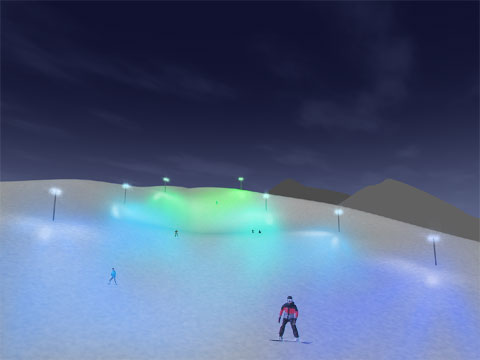 ゲレンデをフルカラーLED照明で華やかにライトアップすることで、ナイターに必要な明るさは確保しつつ魅力的な光景をつくり、訪れた人々を楽しませます。