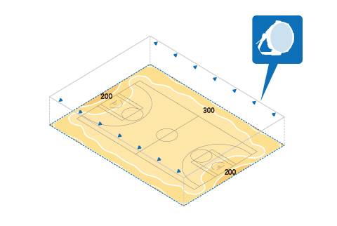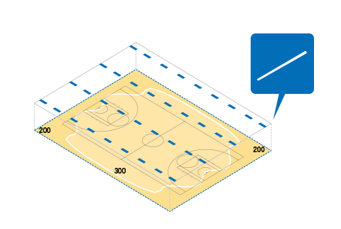競技の進行方向や競技する際に常に視線に入るおそれがある場所への設置は避けなくてはなりません。屋内体育館の場合には、天井、壁などに照明器具を設置して照明します。天井から照明する分散配置や壁から照明するサイド配置などそれぞれの手法に特長があるので、グレア・メンテナンス方法などを考慮して各施設にあった照明手法を選定し配置する必要があります。