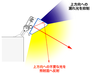 高照明率フードにより上方向への漏れ光を抑制・下方向に反射させることで、照明率を向上させることが出来ます。これにより光害対策に加え設置台数を最小限に抑えることが可能です。