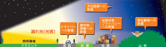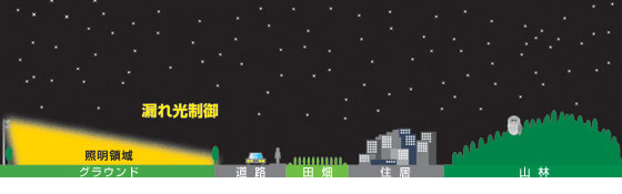 周辺環境への影響を考慮し、光漏れを抑制することが重要です。照明塔の配置の検討や、ルーバ付投光器の使用、あるいは、樹木・フェンス・観客席などで競技面を覆う方法も有効です。