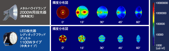 レディオック フラッド デュエルとHID投光器の輝度分布比較