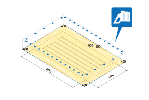 照明器具の配置は、競技を行う上で重要なポイントです。配置条件によっては、選手や観客へのグレア、競技や観戦に支障を与える選手の影、鉛直面照度の不足といった問題が生じる原因になります。推奨する照明器具の配置例を示します。