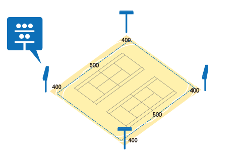 投光照明による照明器具の配置は、サイド配置とコーナー配置の2方式があります。サイド配置は、グレアが少なく取付高さを低くすることができるという利点があります。コーナー配置は、グレアが生じやすいため取付高さを高くする必要がありますが、ボールを見るために重要な競技方向の鉛直面照度が得やすい手法です。照明器具の配置例を紹介します。