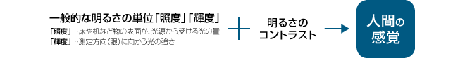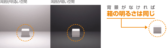 壁の色が異なる空間に、同じ色の箱を入れて見比べると、箱の明るさが違って見えます。周囲の明るさによって、見え方が変化したためです。QUAPIXは対象物と周囲との明るさのコントラストを考慮して、人が感じる明るさを数値化します。