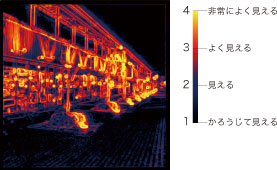 視認性画像は、人が対象物を見たときの、見えやすさの度合いを表すものです。非常によく見える(4)から、かろうじて見える(1)まで、視認性尺度値にて、ものの見えの程度を表現しています。一般に、視認性が落ちるとされる高齢者のパターンでも解析することができます。