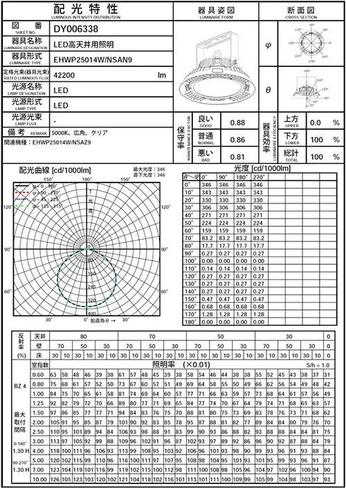 照明率は、図2.1に示すような光源(照明器具)の照明率表と室指数から求めることができます。