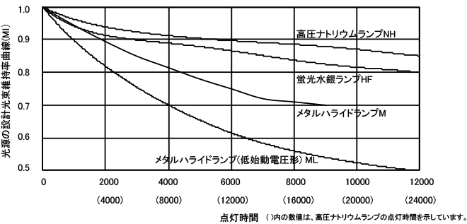 図2.3 HIDランプの設計光束維持率曲線(Ml)