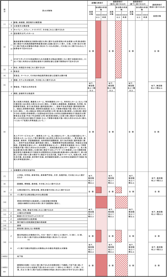 - ※1:(1)項イ、(4)項、(5)項イ、(9)項イに掲げる防火対象物の用途に供されているものを除きます。