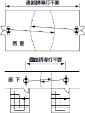 廊下または通路の各部分が、避難口誘導灯の有効範囲に包有される場合、通路誘導灯は不要です。