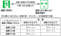 | 避難口誘導灯 | A級 | 避難の方向を示すシンボルのないもの | 0.4 | 60 | Dは歩行距離(m) hは表示板の縦寸法(m) kは区分に応じた係数 |