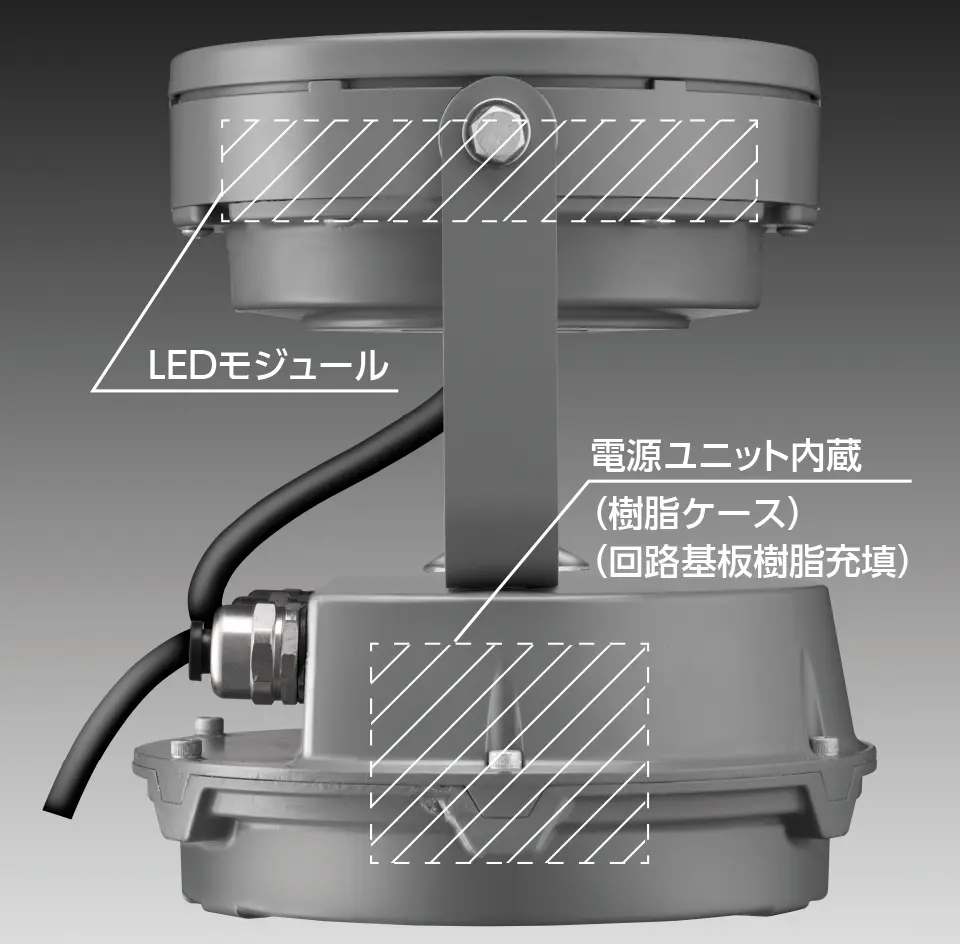 電源部を二重絶縁構造とし、電気的な安全性を確保しています。また、LEDを搭載する灯具部も結露対策として二重構造を採用しています。