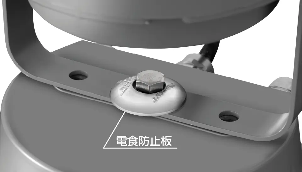 灯具本体、電源ケースに従来のアルミダイカスト“ADC12”の約8倍の耐食性能を有する“ADC6”を採用し、さらに表面に耐食処理を施しています。また、ねじ類は電食防止処理したステンレス製を採用し、かつ、電食防止板を併用することでアルミの腐食を防止する対策を講じているため、長期間の使用※が可能です。