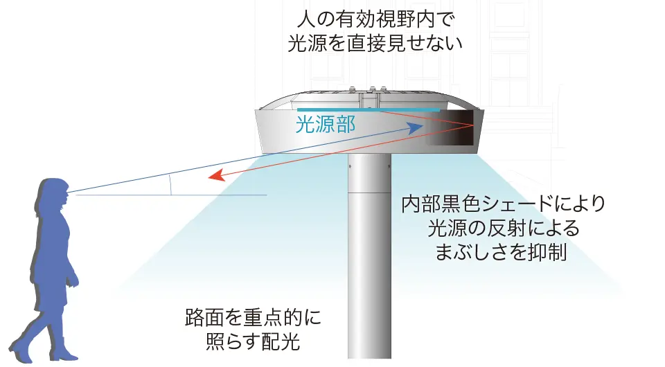 灯具発光部がまぶしいと、まぶしさに順応して周辺が見づらくなると共に路面が暗く感じられる。