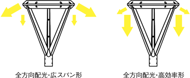 また、全方向配光は、広がりを重視した「広スパン形」と効率よく路面照度を確保する「高効率形」を標準ラインアップし、適材適所な多彩な配光バリエーションより選択が可能です。