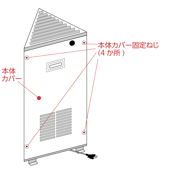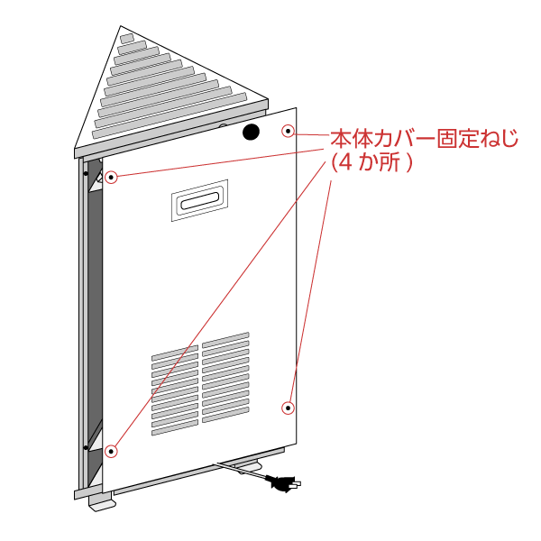 本体カバーが落下しないよう押さえながら本体カバー固定ねじ(4か所)を外してください。