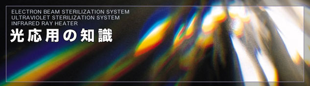 光応用の知識 電子線滅菌近年、食品関係、医療関係その他の分野では滅菌レベルの殺菌が必要とされてきています。当社の低エネルギー型リニアフィラメントEBプロセッサーは放射線であるEBにより、バクテリアその他の微生物を高速で滅菌するものです。 紫外線殺菌放電灯の総合的技術を応用して、高品質な殺菌処理、ハイクリーン処理、ハイスピード処理を実現した短波長紫外線による紫外線殺菌システムです。 赤外線加熱ハロゲンランプの近赤外線の特長(光コントロール可能、効率がよい、瞬間的な温度上昇、クリーンで安全など)をいかし、印刷・塗料の乾燥、半導体ウェハーの加熱、PETボトル成型時の加熱など、加熱用途での利用が広がっています。