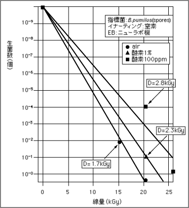 酸素は放射線滅菌に増感効果を及ぼすことが知られています。つまり、照射中の雰囲気酸素濃度が高いほど滅菌効果が高いということです。照射前や照射後に酸素を与えても滅菌効果が変わらないことから、酸素効果は照射によって生じたラジカルが関与した複雑な反応の結果であると考えられています。
