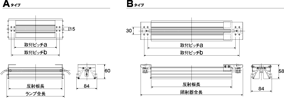 | 照射器 | 適合ハロゲン電球 | 反射板長 | 取付ピッチa | 取付ピッチb | 照射器全長 | 発光長 | 質量(g) |