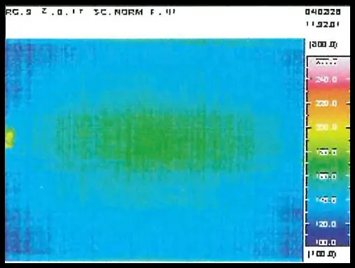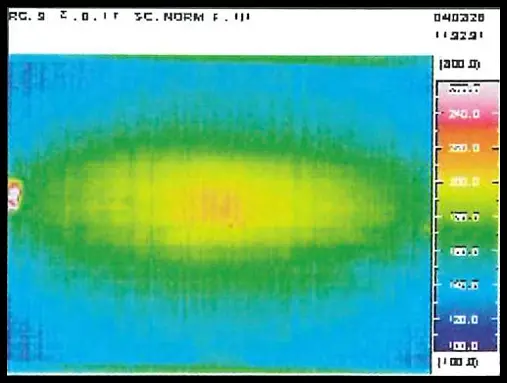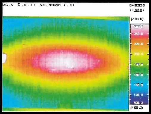 実際の距離50mmの位置でステンレス板の表面温度の分布を放射温度計で測定した結果は図21のとおりであり、ライン状に均一に照射されていることが確認できます。