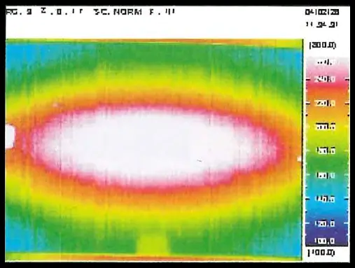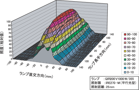 一例としてQIR200V1000Wのハロゲンランプと平光型照射器(lRE270-M)で照射距離を25~200mmと変化させ、近赤外線照度計(λmax=960nm)にて、ランプの直交方向と長手方向のピークを100%とし配光データをとった結果が図18です。また、3次元の配光分布のイメージは図19です。温度上昇データ例を図20に示します。