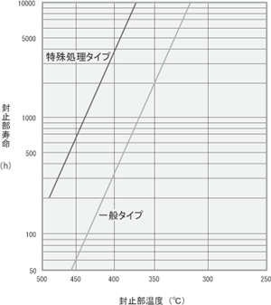 5000時間の寿命時間を得るためには、シール部に封止していますモリブデン箔の温度を300℃以下に保つ必要があります。炉体内に封止部が入る場合には、冷却設備が必要な場合があります。