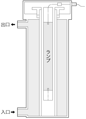 対象水は照射槽の内壁面と石英ジャケットの間を紫外線ランプによって照射されながら通水されます(図 - 流水殺菌装置の構造 参照)。