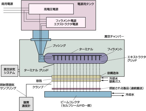真空チャンバーで発生した電子を、高電圧で加速します。ビームとなった電子は窓箔を通過して、大気圧雰囲気の対象物に照射されます。EB装置の概要をシステム図に示しました。