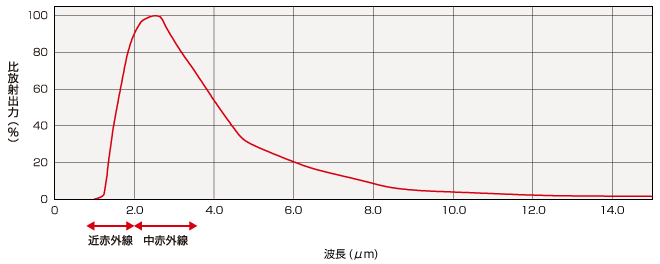 ピーク波長が2.6μmと近赤外線より長波長側にあり、近赤外線と遠赤外線(加温効果)の両方の特長をもった加熱用光源です。