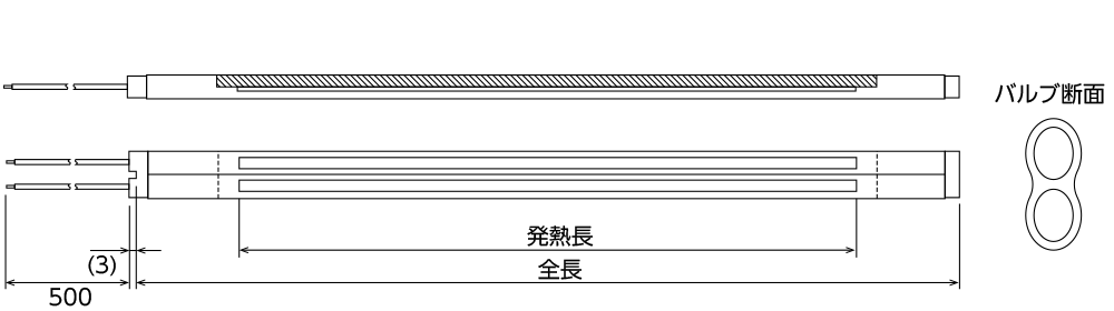 - ※サークル形状やシングルバルブ形状などツインタイプ形状以外の形状でも中赤外線ヒータの設計が可能です。