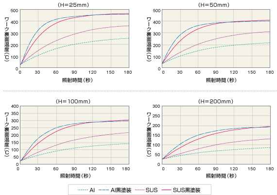 - ワーク:ランプ直下・中央位置、サイズ25x25x1t(mm)、裏面温度