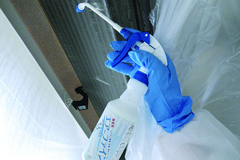 熱交換器専用の除菌・抗菌・消臭効果のあるエアーファインでスプレーコーティングします。