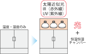 従来の環境試験では、空調機器による温度変化と加湿器による湿度変化が中心でした。岩崎電気はこれに、日射条件を加え屋外環境に近づけました。