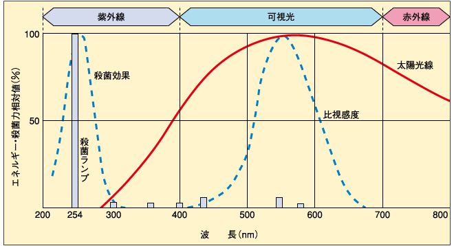 アイ殺菌ランプ(紫外線ランプ)は、250~260nmの紫外線を放射する特殊な低圧水銀ランプです。