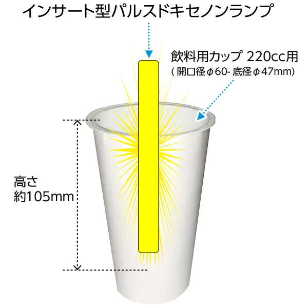 インサート型パルスドキセノン殺菌システムは、容器の内部に直接キセノンフラッシュランプを挿入し、容器内部で発光させるため、深型容器でも内部に均等に紫外線を放射することができます。
