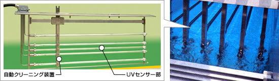 また、自動クリーニング装置を標準装備し、UVセンサーにより正常稼動を確認できるので、維持管理の省力化と連続無人運転を実現。従来製品と比べてランニングコストの大幅な低減を実現しました。