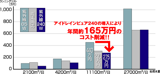 「アイ ドレインピュア240」は効率のよいランプ使用によりイニシャルコスト、ランニングコストともリーズナブルで、1500m³/日を超える中規模施設からおすすめできます。処理水量が100000m³/日の大規模施設への対応も可能です。