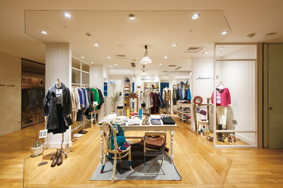 株式会社ヰノセントが展開するシャンブル ド ニーム玉川高島屋S・C店が4階から2階に移動し、装いも新たにRelaxation(ルラクサスィヨン)として2013年9月にオープンしました。大宮店に続き2店舗目となるRelaxationは、ナチュラルなフレンチテイストのアイテムを揃えたレディースファッションのコンセプトショップで、大人のエレガントさ、粋を感じさせるリラックススタイルを提案しています。大宮店同様、白を基調にブルーをアクセントカラーとして使い、ナチュラルなウッドフローリングとアンティークの什器が温もりのある雰囲気をつくり出しています。照明については、省エネに配慮のうえ、LEDユニバーサルダウンライト47Wをベース照明として採用し、ブルーのロゴを照らすなどポイント照明にはLEDユニバーサルダウンライト14.6Wを選択、奥行き感と明るさ感を加えました。また、色温度は3500K(温白色)とし、適度にカジュアルかつエレガントで居心地のよい店舗空間にふさわしい快適な照明環境となるよう留意しました。
