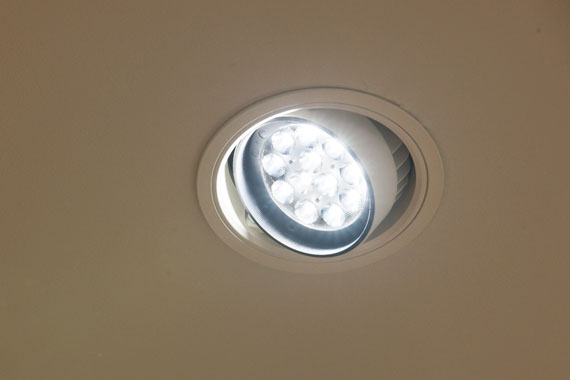 白を基調にブルーをアクセントカラーに使った魅力的なショップを温白色LEDの光で照らし、省エネと質の高い照明環境を実現