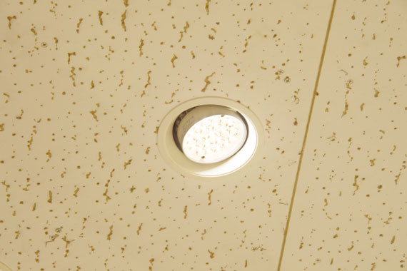 照明についても、1つの店舗スペースの中に2つのショップがあるため、それぞれの雰囲気を壊さず一体感が感じられるよう、器具選定を行いました。天井高が3200mmと高いので、2本の柱上部にも光を配し、空間を効果的に見せる演出を行うとともに、各エリアの重点商品をより魅力的に照らし出すなど、訴求効果の向上を考えた照明計画としました。省エネに配慮したLEDのダウンライト及びLEDユニバーサルダウンライトは温白色を選定し、落ち着きのある光で高品位な照明環境を創出しています。