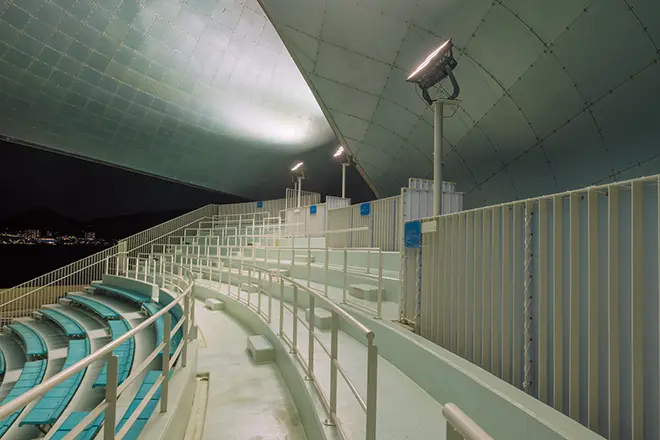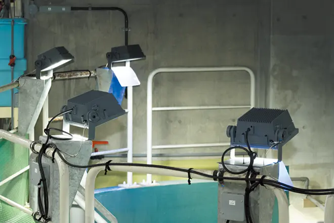 しものせき水族館 海響館では、施設・設備の大規模改修工事を行い、新たな魅力の創出としてアシカの展示繁殖施設「ひれあしビーチ」も加わり、2025年8月にリニューアルオープンしました。下関市が掲げる「ゼロカーボンシティしものせき」の方針に基づいた改修工事の一環として、「関門海峡」水槽や「イルカスタジアム」、フグ、クラゲ、アマモの水槽や「瀬戸内海」水槽などに岩崎電気のLED照明器具をご採用いただきました。LED化にあたっては、生き物がもつ本来の美しさを引き出しながら、館全体として快適な鑑賞環境を両立することを目指しました。基本的には既設照明の1対1交換によるリニューアルで、極力既存の取付位置をいかしつつ、光の方向性や照度バランスを再設計しています。