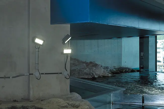 「関門海峡」水槽には、高演色タイプのLED投光器「レディオック フラッド アヴァン 屋内用 400クラス」と「レディオック フラッド ネオ80クラス 高演色形」を配置。フグの中でも高級なフグとして有名な「トラフグ」水槽には、水槽上部にLED投光器「レディオック フラッド ネオ 120クラス」を、水槽裏側には「レディオック マルチライン トラフ形」を配置し、これまで以上に奥行感を演出しました。それぞれの展示テーマに合わせて光色・照度・演出方法を最適化し、全体として光のリズムと海の多様性を感じられる空間を創造しています。基本的に既設水銀ランプやナトリウムランプと同等の明るさのLED照明器具をご採用いただきましたが、改修後は大幅な省エネを実現すると同時に、とても明るく見やすくなり、来館される皆さまからもご好評をいただいています。