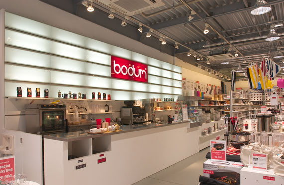 Bodumの商品はコーヒーメーカーやティーポット、ガラス食器などクリアな素材が多いことも考慮のうえ、きらめくプリズムグローブが賑わいを演出する透明プリズムタイプのセードと演色性に優れたセラルクスランプを組合せ、またスポットライトを加えることで、より効果的に空間を照らし出しています。高品質な光で、奥行きのある店舗に均一な照度を確保し、デザイン性と機能性を両立した照明環境としました。