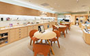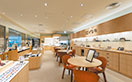 今回のリニューアルでは、みなとみらいの高層住宅居住者など近隣にお住まいの方々をはじめ、観光客の皆さまなど幅広い層のお客さまが訪れる店舗にふさしい、上質で魅力溢れる店舗となるよう、什器やカーペット、パネルの素材などを検討のうえ、天然の木を用いた什器を新たに配し、カーペットの色もピンクがかった茶色とするなど、自然な色味のテクスチャーを効果的に使って暖かみのある、居心地のよい空間に仕上げました。既設のピンクオレンジ系の色味が特徴的な大理石の高級感をいかして、天井下の壁面には薄いグリーンの塩ビシートを貼り、色のコントラストをつけるとともに、商品陳列棚は背面をホワイトとしてファッション性と機能性を兼ね備えた商品をクリアに見せています。また、限られた店舗スペースをより効率よく有効に使うため、横長の店舗中央に自然素材の接客テーブルを配し、左右に陳列棚を新設した他、既設ミラーの下部分を回り込むように什器を置いてステージをつくるといった手法を取ることで、商品スペースの拡充を図りました。